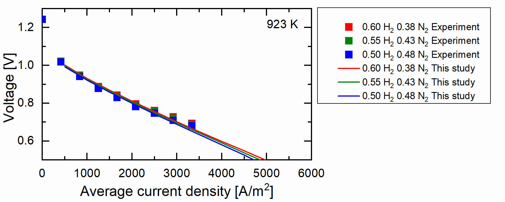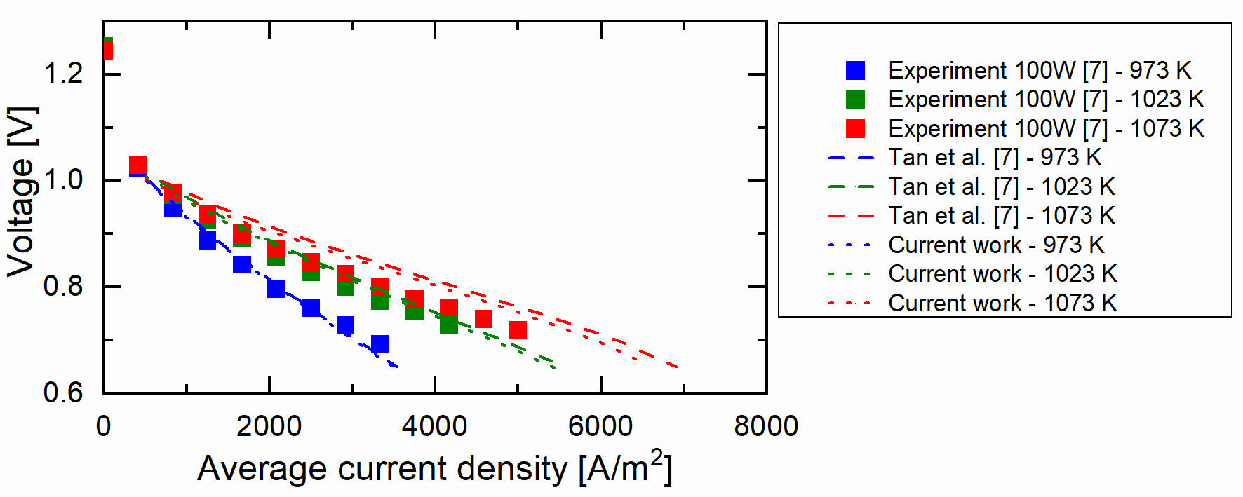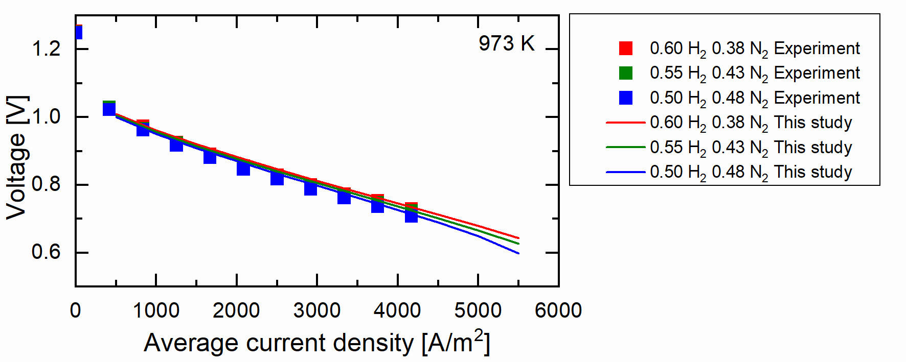 3. The operating temperature is 973 K which is within the operation temperature range of an IT-SOFC.